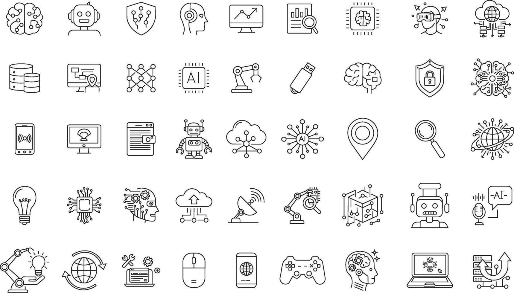 Artificial intelligence and technology icons set featuring AI, robotics, machine learning, cloud computing, and neural network in modern line style . 45 icons sheet Pro Vector