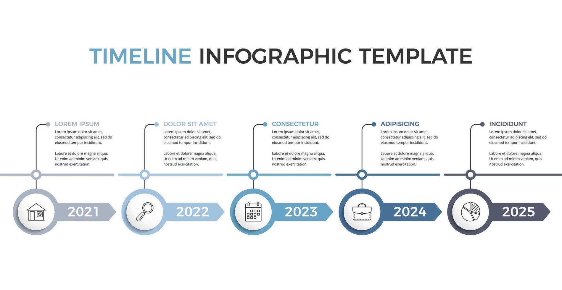 Horizontal timeline infographics template with five arrows with place for icons, dates and text Pro Vector