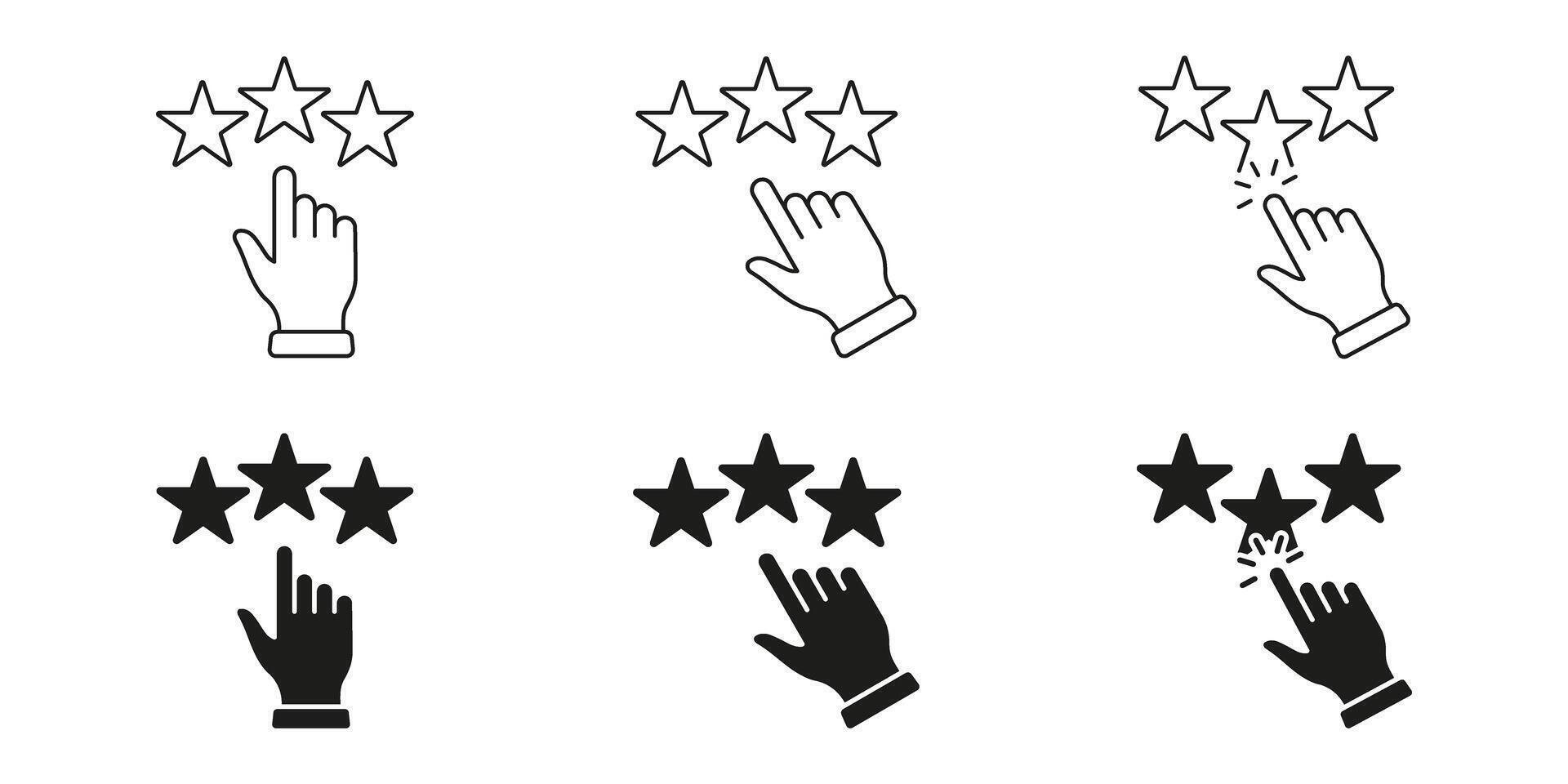 Hand Selecting Star Rating Line And Solid Icon Set. Customer Feedback, Review, And Satisfaction Evaluation Symbol Collection. User Experience And Quality Assessment. Isolated Illustration Pro Vector