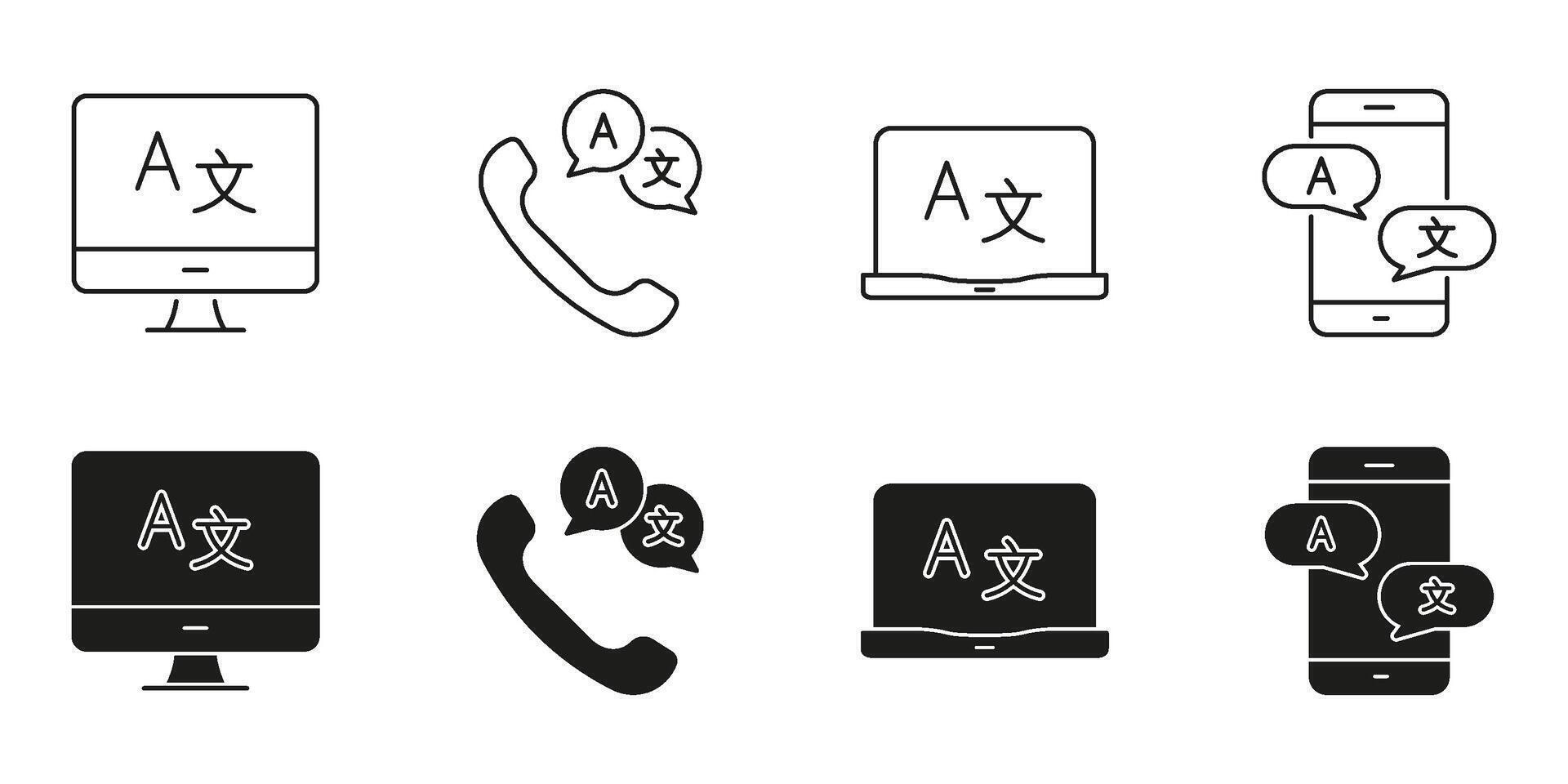 Multilingual Communication Devices Line And Solid Icon Set. Language Translation And Interpretation Symbol Collection. Computer, Phone, And Mobile Interface Icons. Isolated Illustration Pro Vector