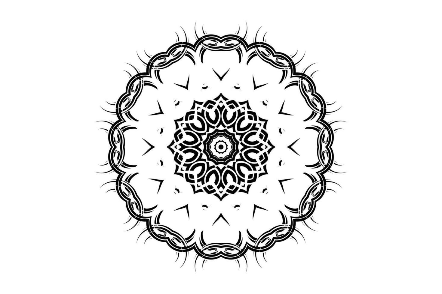 Symmetrical black and white mandala illustration with circular layers of loops triangles and geometry vector