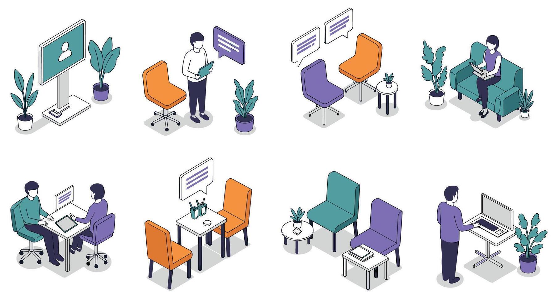 Modern office communication scenes with isometric design elements for remote work and collaboration Pro Vector