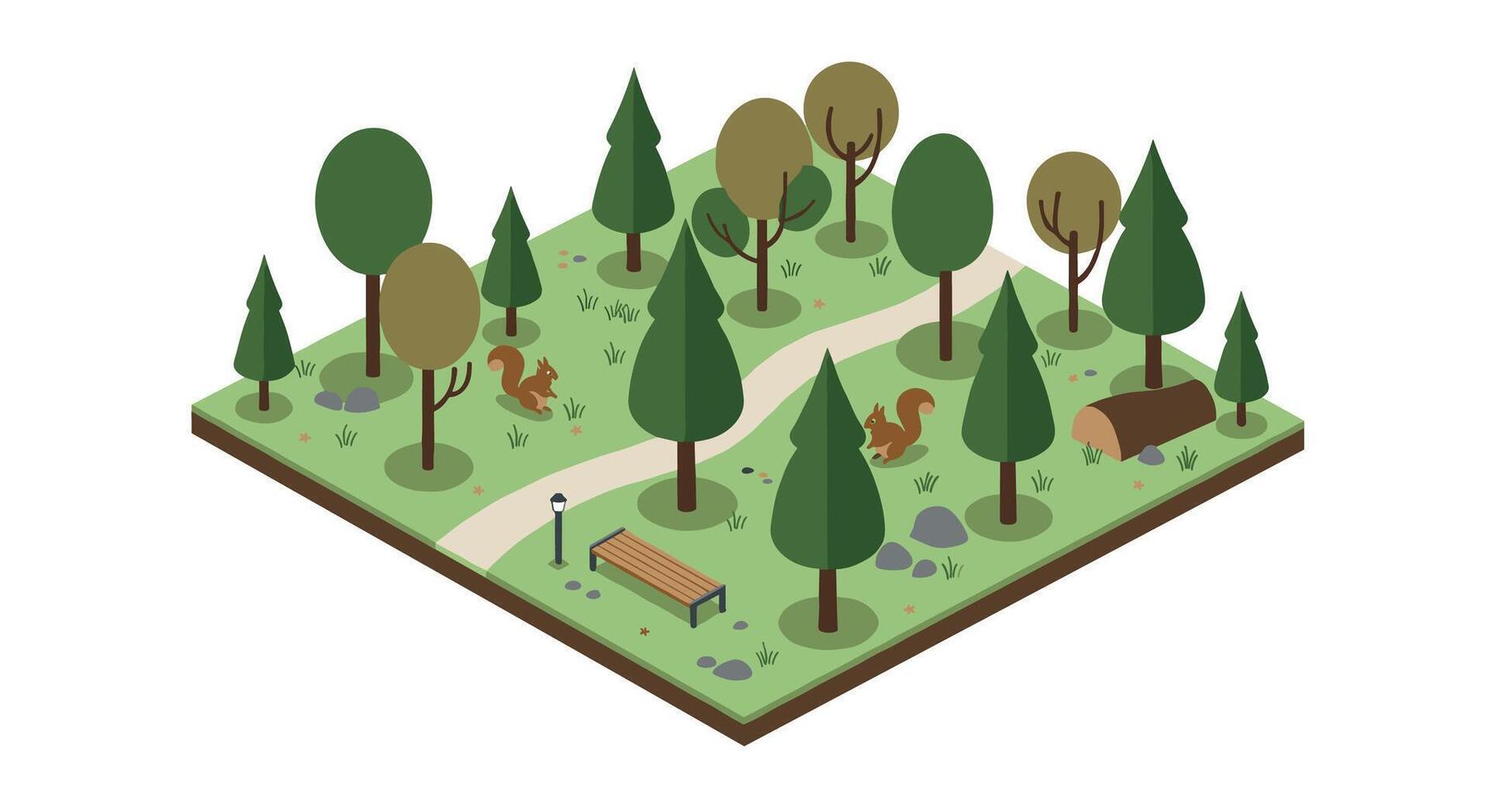 Isometric forest park scene with squirrels and trees in flat style Pro Vector