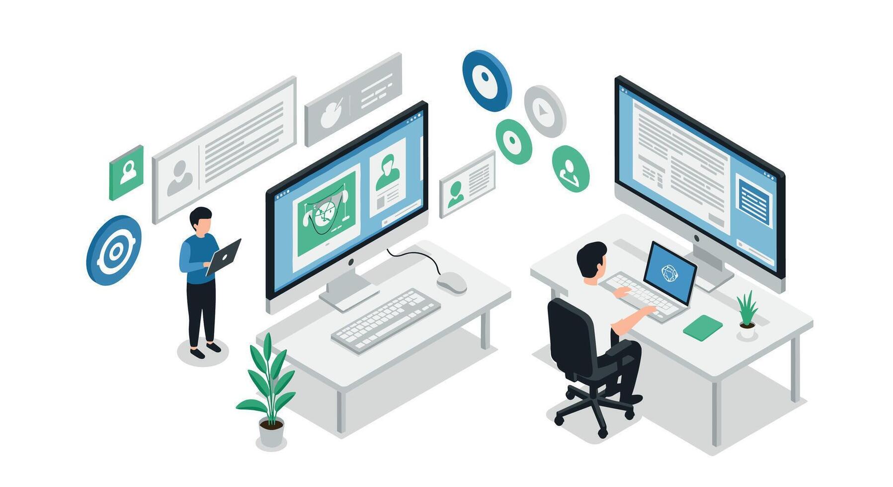 Modern office isometric design with people working on computers and digital interfaces Pro Vector