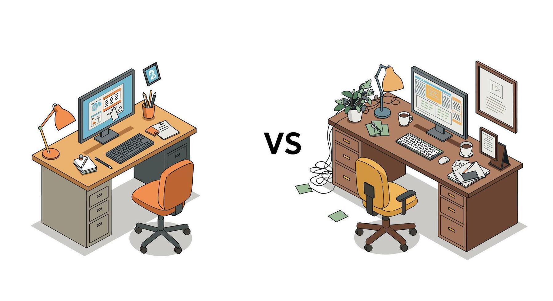 Tidy vs messy workspace concept with isometric design for productivity comparison Pro Vector