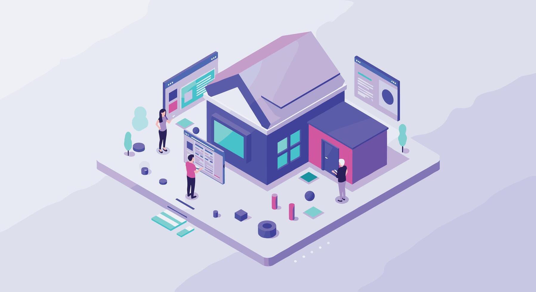 Isometric home design teamwork scene with digital interfaces and collaborative tools Pro Vector