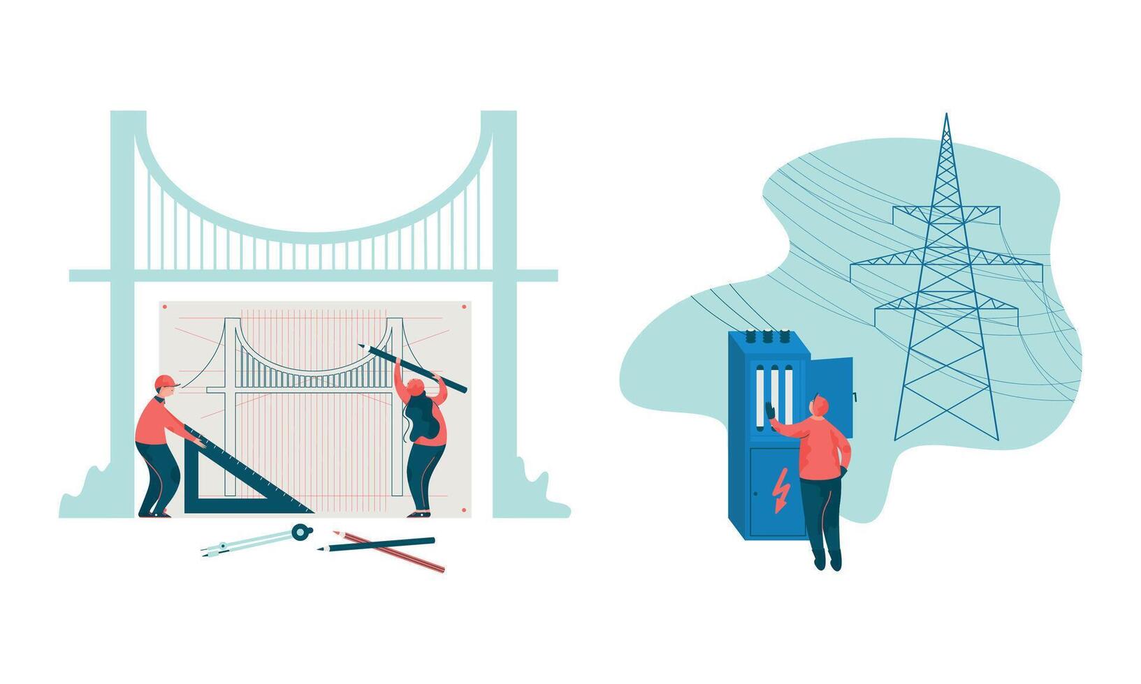 Project Team Engineering Bridge Creating Draft and Checking Electric Circuit in Transformer Vault Set Pro Vector