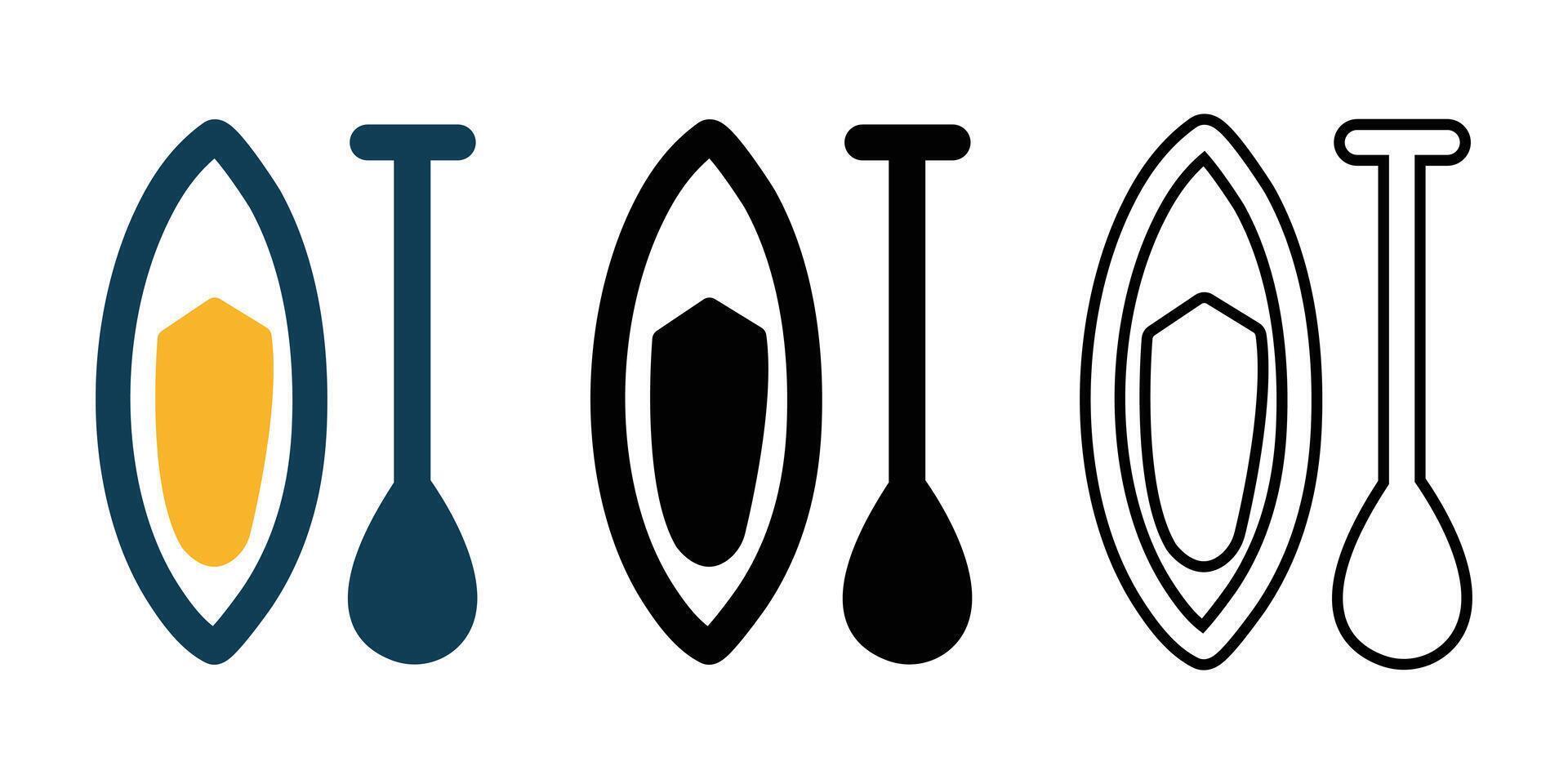 Three stylized kayak and paddle icons showcase diverse design styles on a white background Pro Vector