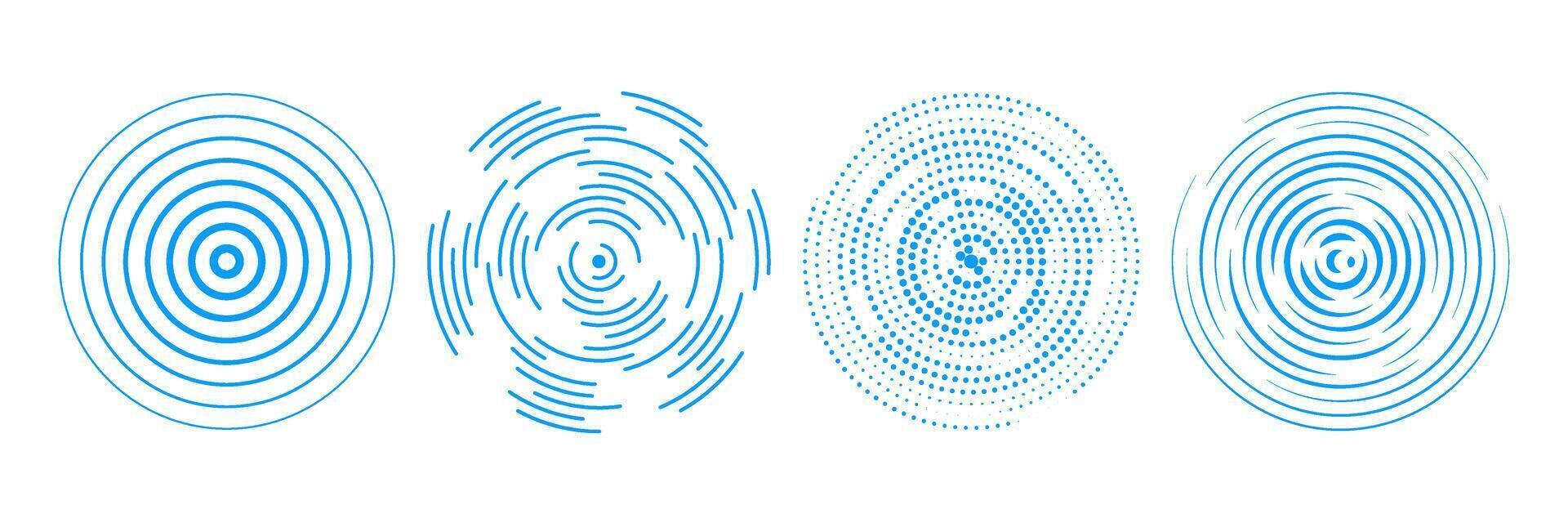 Blue radial concentric circle set. Halftone, dashed and dotted rings for epicenter, target, radar, earthquake, tsunami symbol. Sound wave signal collection. Ripple expansive vibration elements Pro Vector
