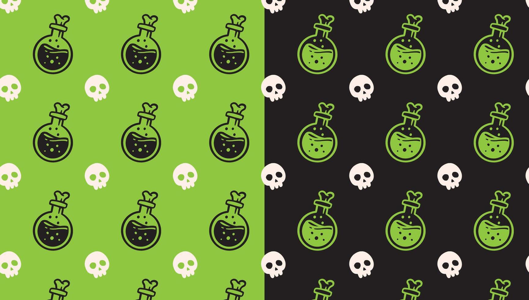 witch potion bottle and skull doodle motif pattern on green black background set for halloween merchandise. magic alchemy flask and skull isolated pattern background. illustration Pro Vector
