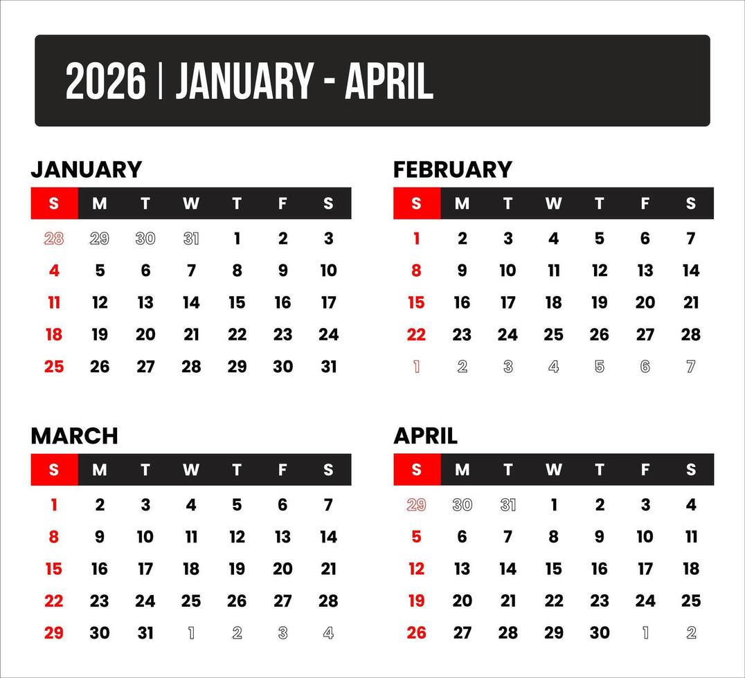 2026 4 months january - april universal calendar design, international format suitable for global use, modern minimal template for print and digital applications Pro Vector