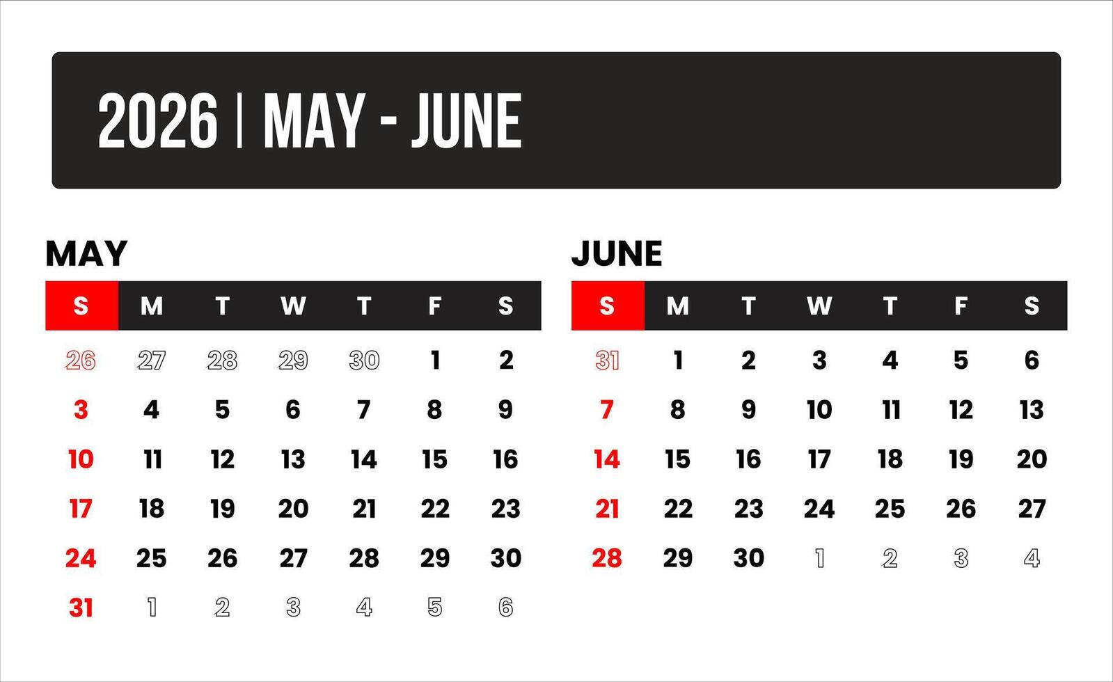 2026 2 months may - june universal calendar design, international format suitable for global use, modern minimal template for print and digital applications Pro Vector