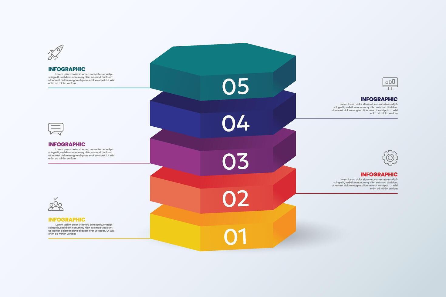 3D hexagonal infographic stacked in 5 layers Free Vector