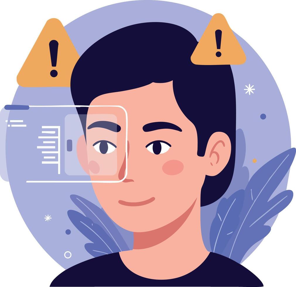 Young man using futuristic augmented reality interface with warning icons and digital data display illustration Pro Vector