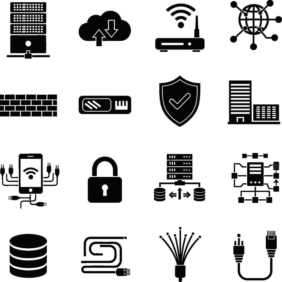 Black and white icons representing networking, security, and connectivity solutions Free Vector