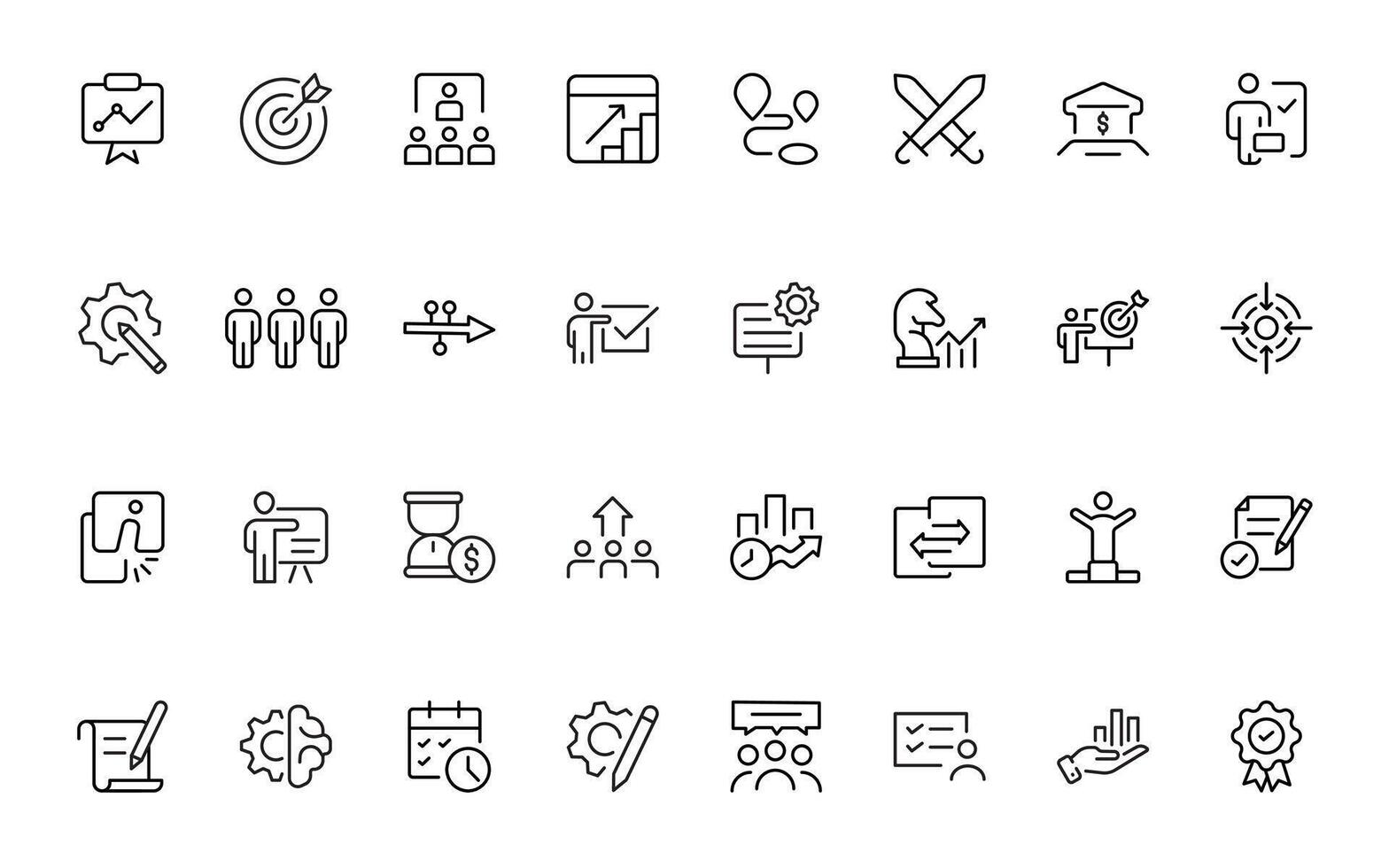 Line icons about action plan. Contains such icons as search strategy, target, scheme, timeline and workflow.Action plan set of web icons in line. Strategy action planning icons. Pro Vector