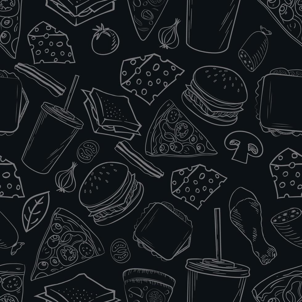 Seamless monochrome gray background pattern on the theme of food and fast food with the image of a hamburger, pizza, drinks and donuts made on a gray background Pro Vector