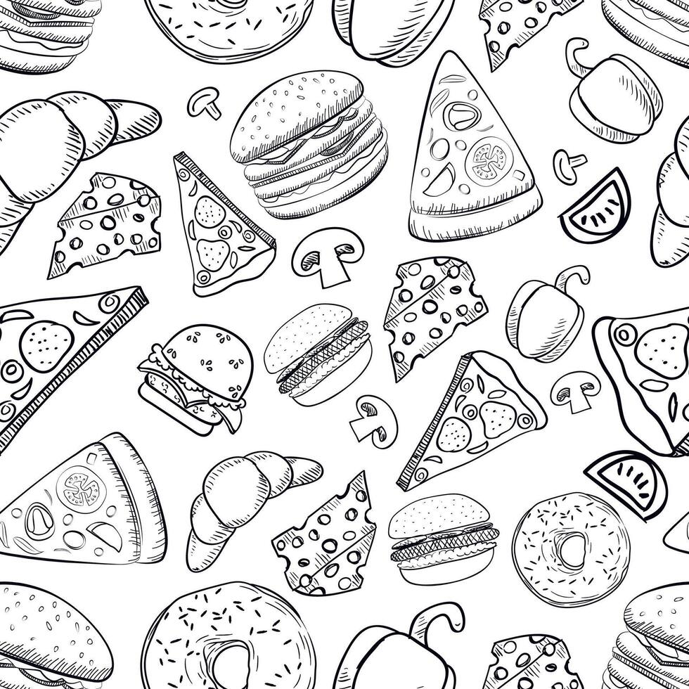Seamless monochrome gray background pattern on the theme of food and fast food with the image of a hamburger, pizza, hot dog, drinks and donuts made on a white background Pro Vector