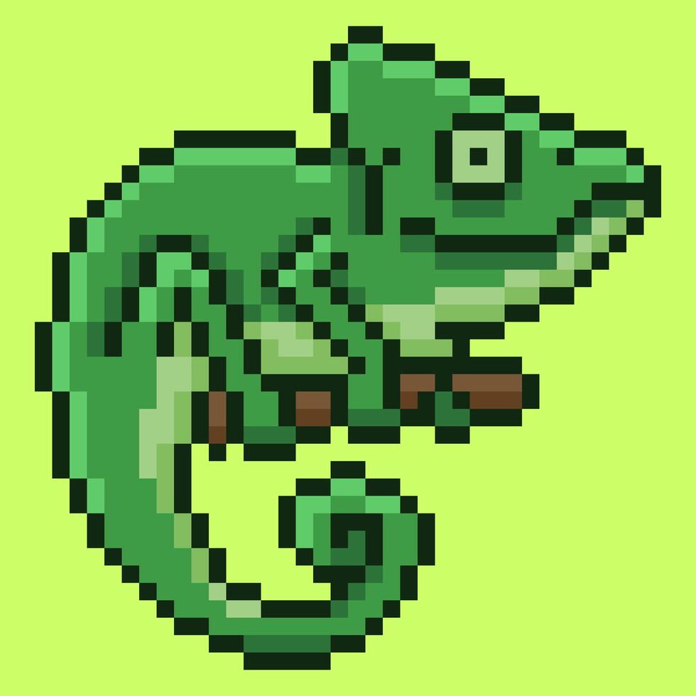 Chameleon icon designed in a classic retro pixel art style. This 8-bit illustration of the unique reptile features its characteristic curly tail and expressive eye Pro Vector