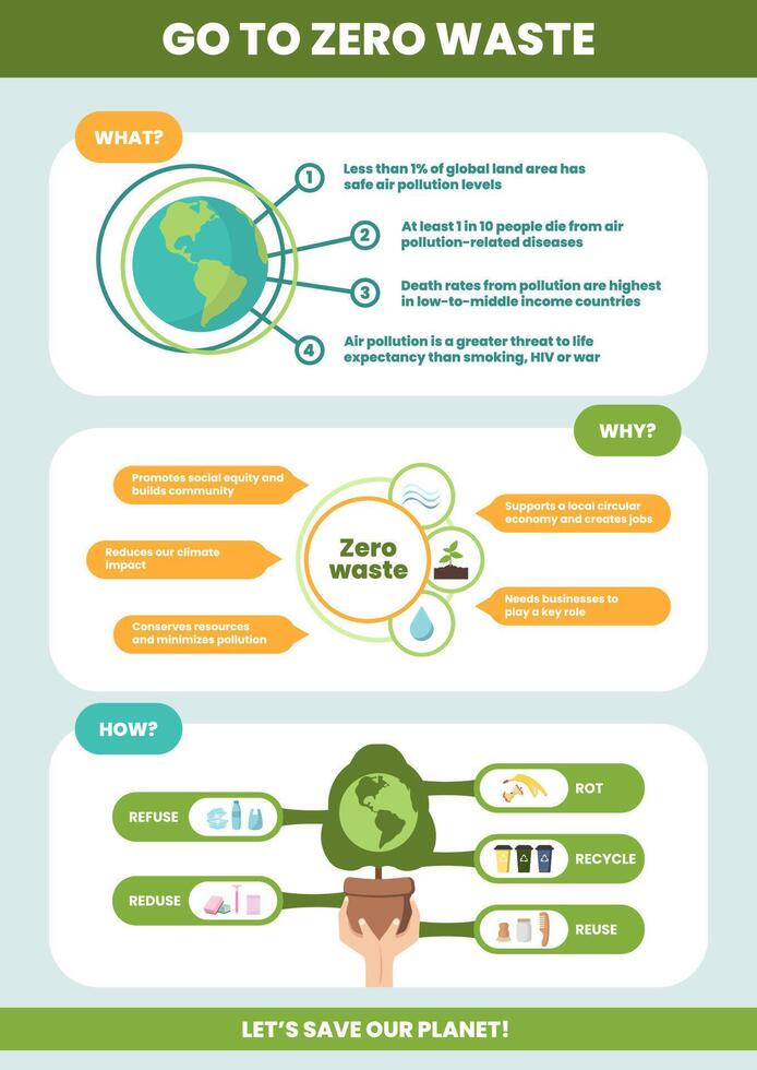 This infographic presents the concepts of zero waste, detailing the impact of pollution on health and the environment. It outlines actionable steps to reduce waste for a cleaner planet. Pro Vector