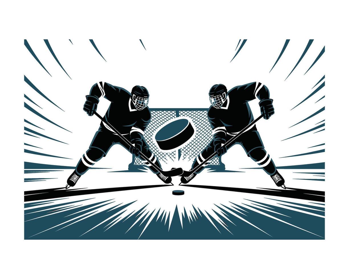 Dynamic illustration of two hockey players in action during a fast paced game with a puck and net vector