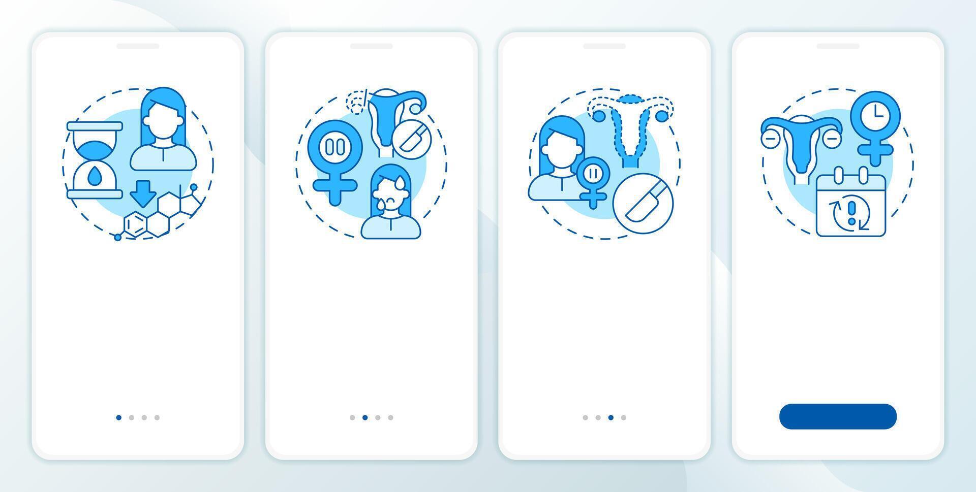 Causes of menopause blue onboarding mobile app screen. Female changing. Walkthrough 4 steps editable graphic instructions with linear concepts. UI, UX, GUI Pro Vector