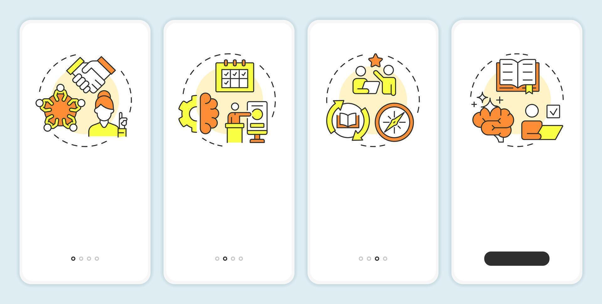 Strategies to improve life skills onboarding mobile app screen. Walkthrough 4 steps editable graphic instructions with linear concepts. UI, UX, GUI Pro Vector