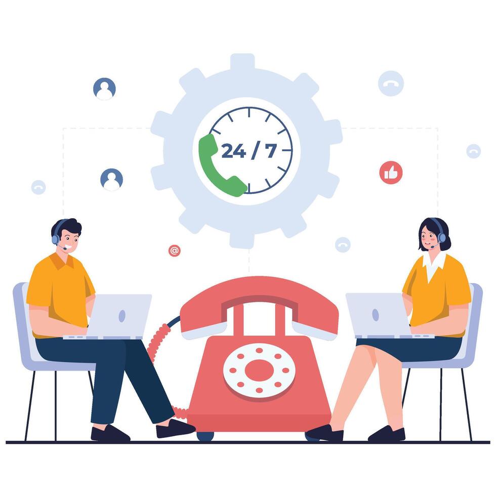 Two support agents with laptops and a retro telephone under a 24 7 gear icon, showing continuous hotline service. Pro Vector