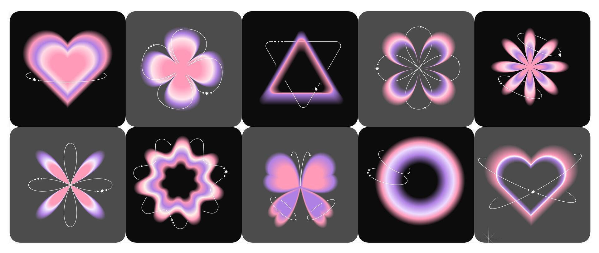 Y2k gradient aura shapes set. Blurred holographic aesthetic elements collection of different geometric forms on checkered background. Pro Vector