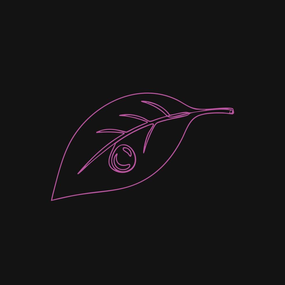 Minimalist neon line art of a leaf with detailed vein structure and a small circular on a dark Pro Vector