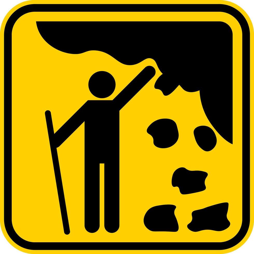 Caution Sign Displaying Hiker Warning About Falling Rocks in Yellow Background Pro Vector