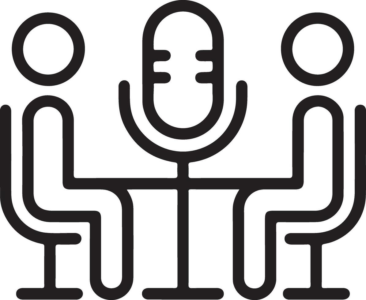 Two people sitting at a table with a microphone in the middle for an interview or podcast Pro Vector