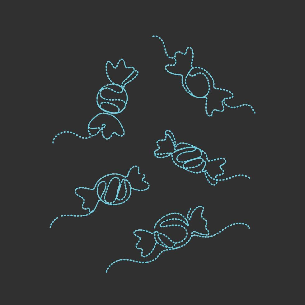 Neon outline of five wrapped candies with dotted lines on a dark , creating a vibrant and playful visual effect vector