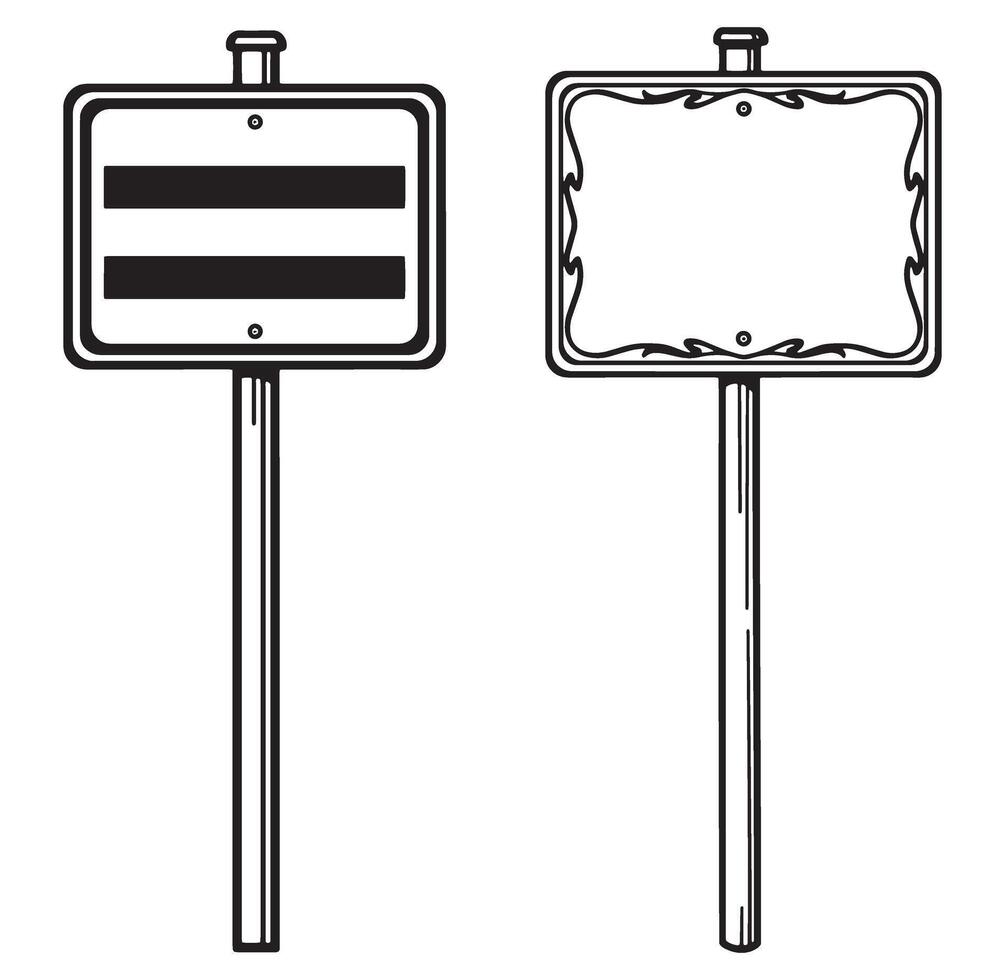 Black and white illustrated signposts with different empty rectangular and scroll frame boards Pro Vector