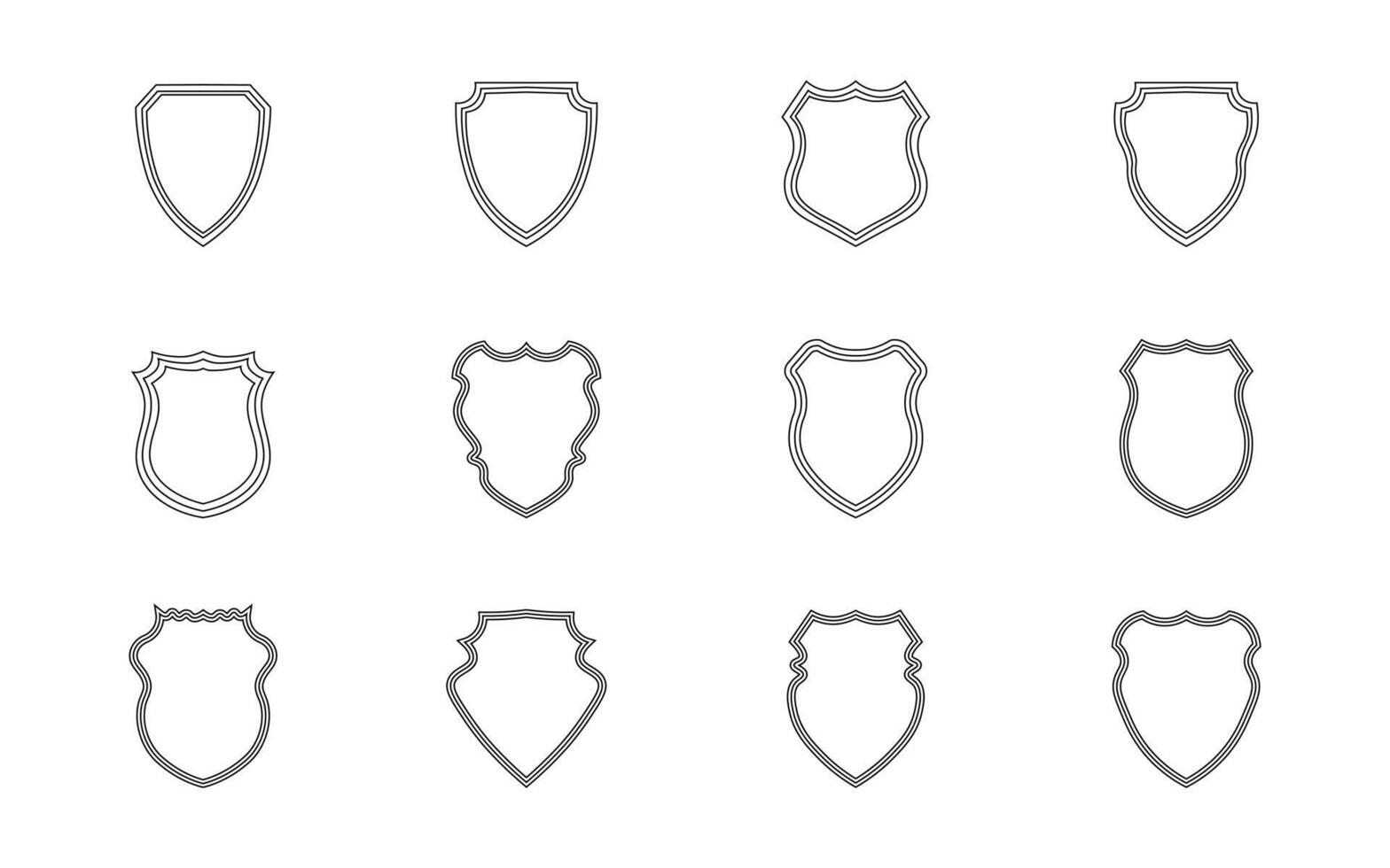 Set of blank shield three outline icons. Collection of simple heraldic badge shapes, black linear emblems of arms templates for logo, label, or security symbol design. Editable Stroke Pro Vector