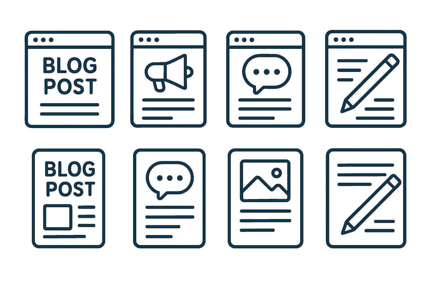 Blog post and content creation icon set. line art symbols of online writing Pro Vector