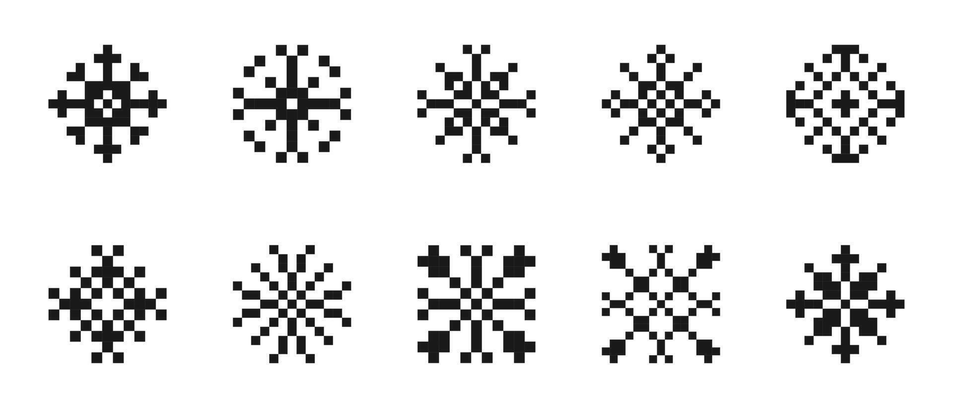 Pixel snowflakes set. Snowflakes geometric shapes. Retro 8 bit pixelated snowflakes. Minimalist pixel elements Pro Vector