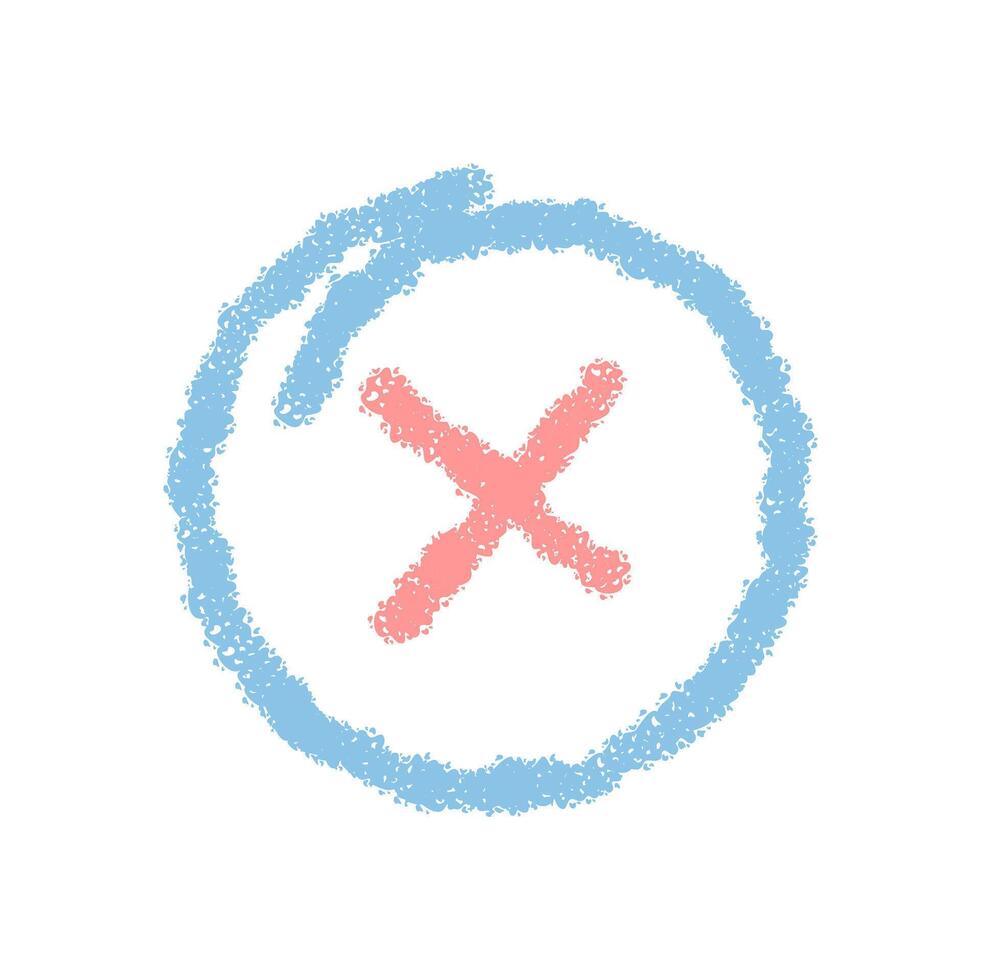 Hand drawn chalk cross icon in a blue circle element. Red crayon symbol appears as a check box illustration in grunge style. Artistic graphic for minimal and modern concepts. Pro Vector
