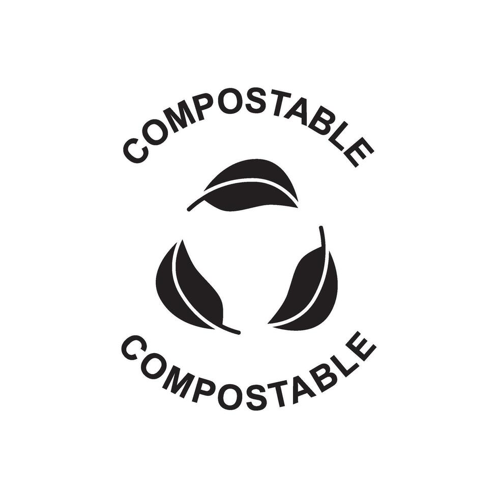 A circular graphic featuring the word compostable repeated twice and three overlapping leaves forming a recycling symbol, indicating biodegradability and environmental friendliness Pro Vector