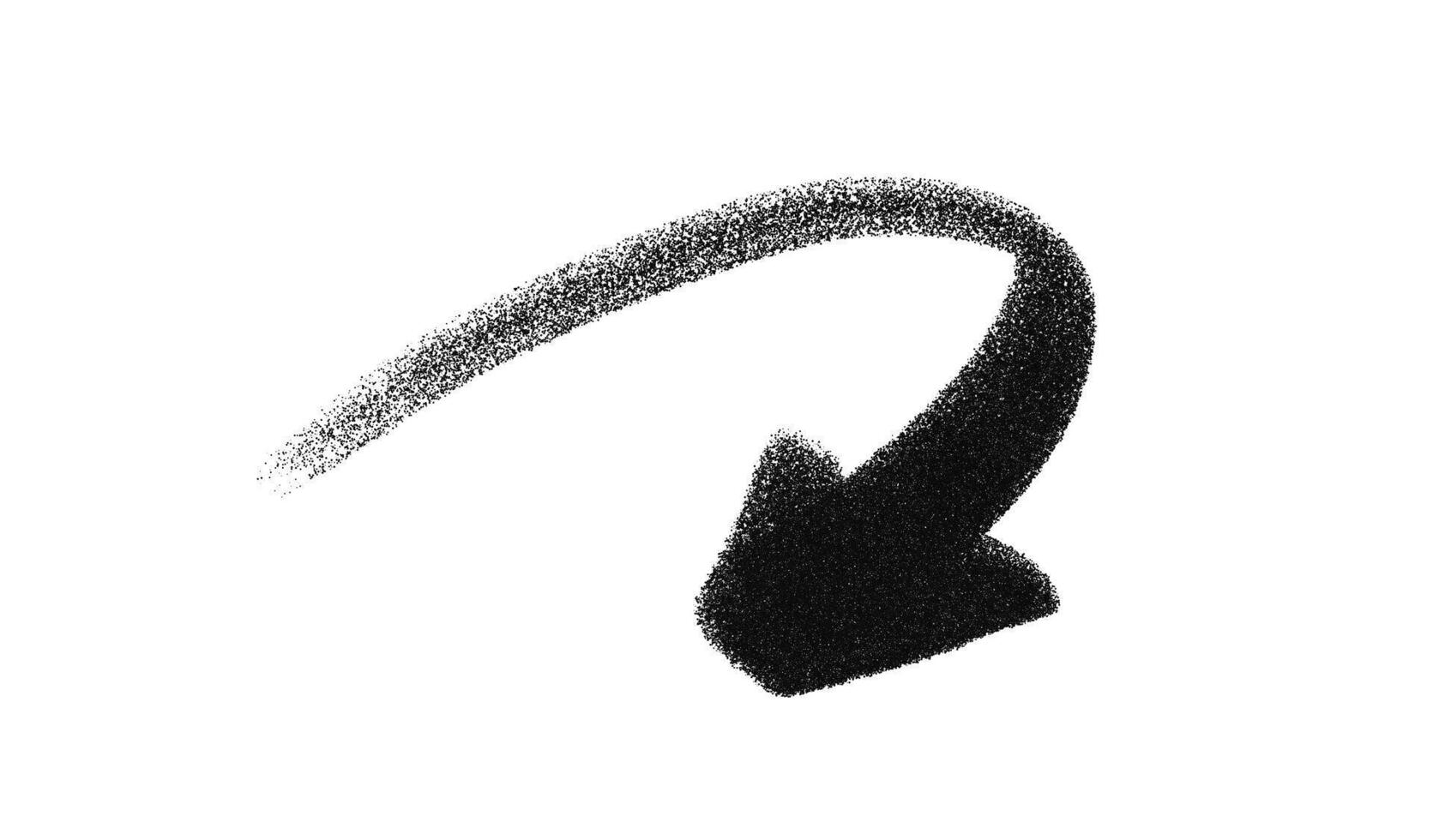 Graffiti arrow in stipple art style with rounded curve pointing down. Spray texture and grain shading in black and white. Abstract arrow for navigation, recycle, street art and creative design Pro Vector
