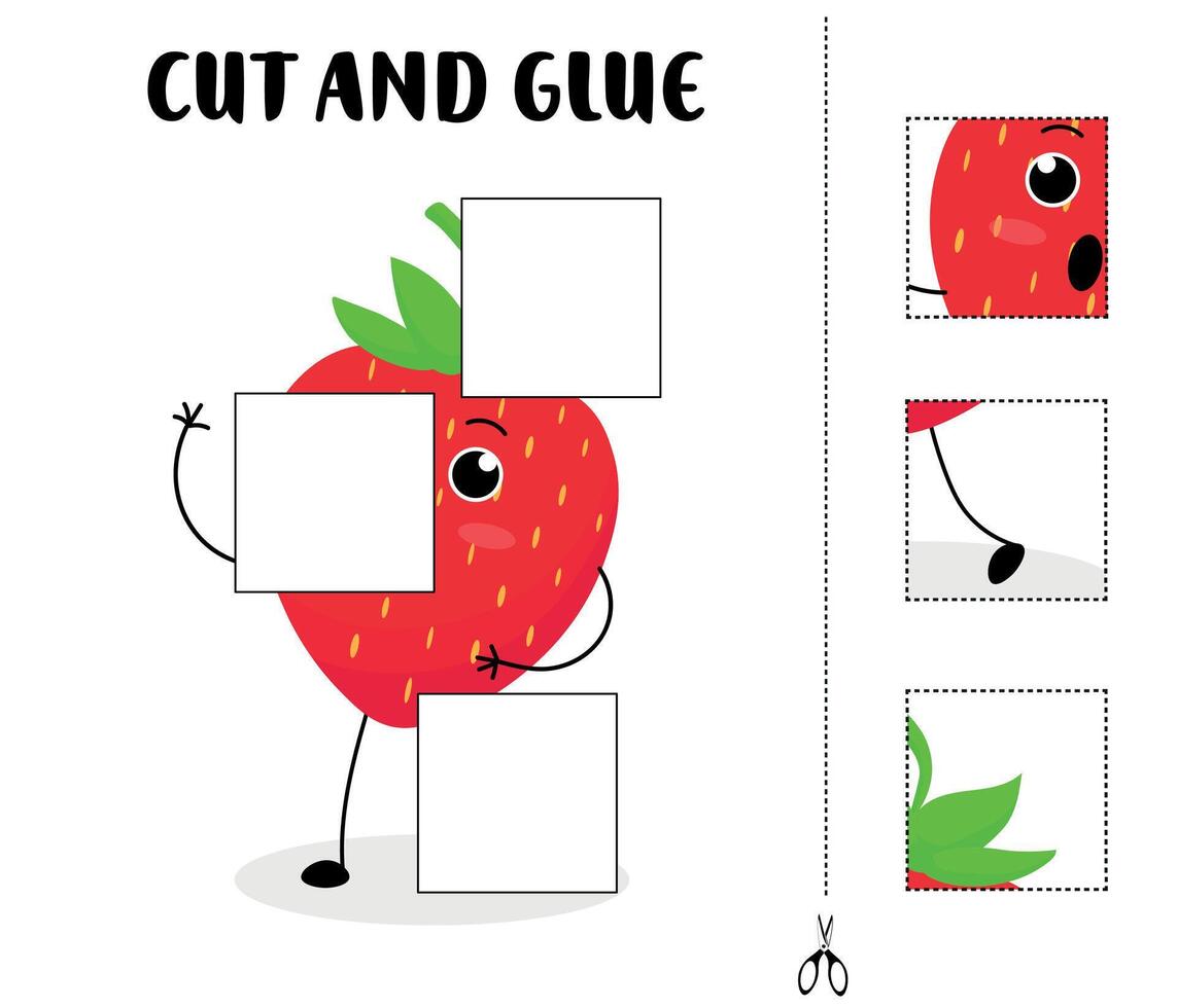Cut and glue worksheet featuring a smiling strawberry with missing parts for kids to match and paste, Pro Vector