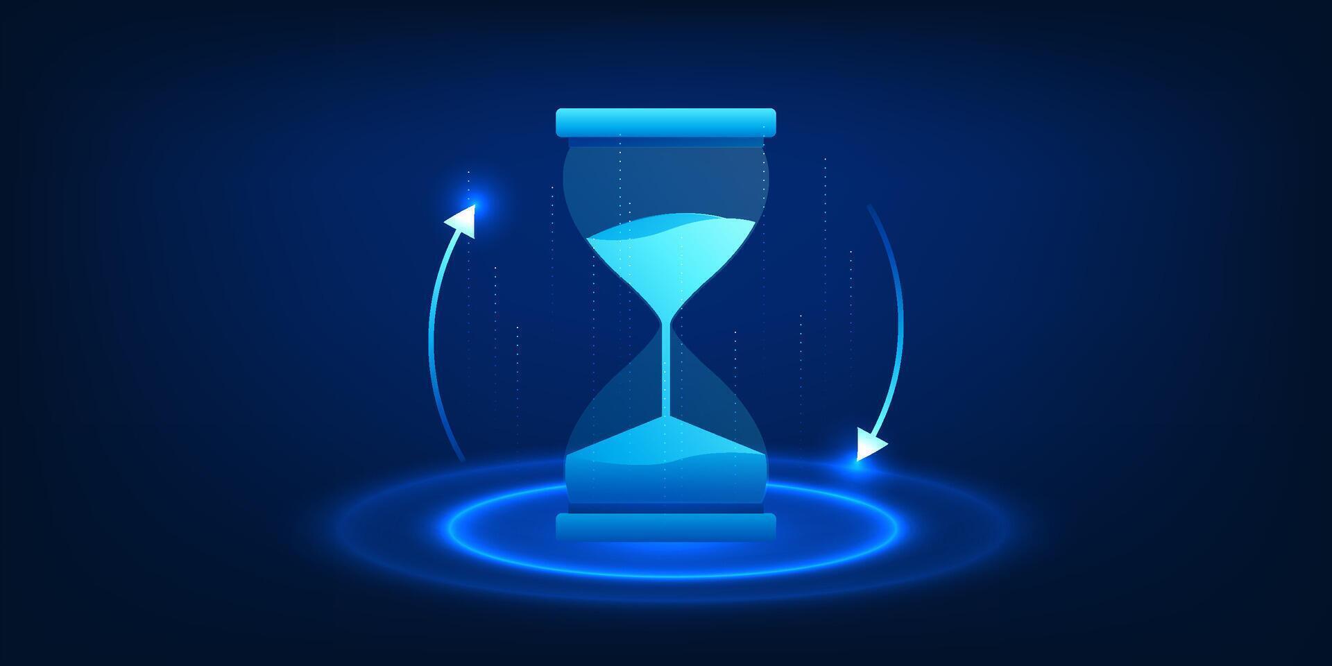 Futuristic digital hourglass surrounded by rotating arrows, symbolizing time flow, technological evolution, and continuous progress in the digital era Pro Vector