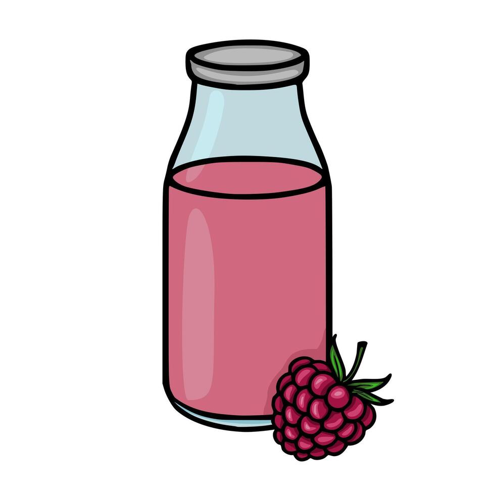 Whimsical illustration of a glass bottle filled with pink raspberry liquid, adorned with a single ripe raspberry and green leaves. Pro Vector