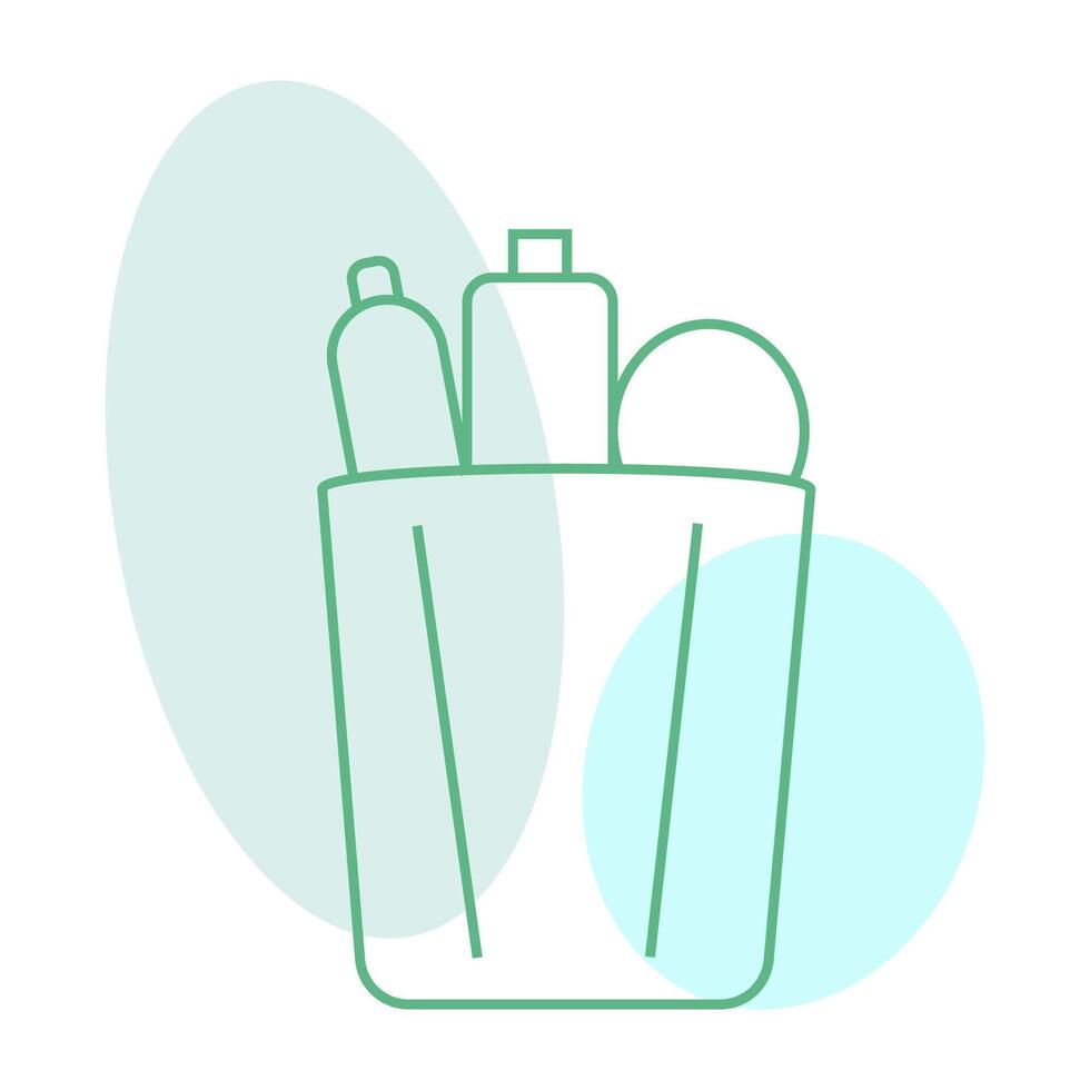 Minimal basket with toiletry bottles and soft background. Pro Vector
