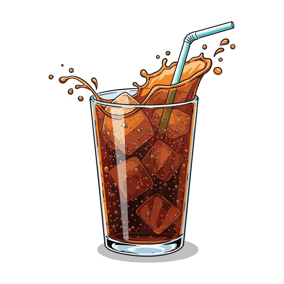 Refreshing fizzy cola splashing with ice cubes and drinking straw Pro Vector
