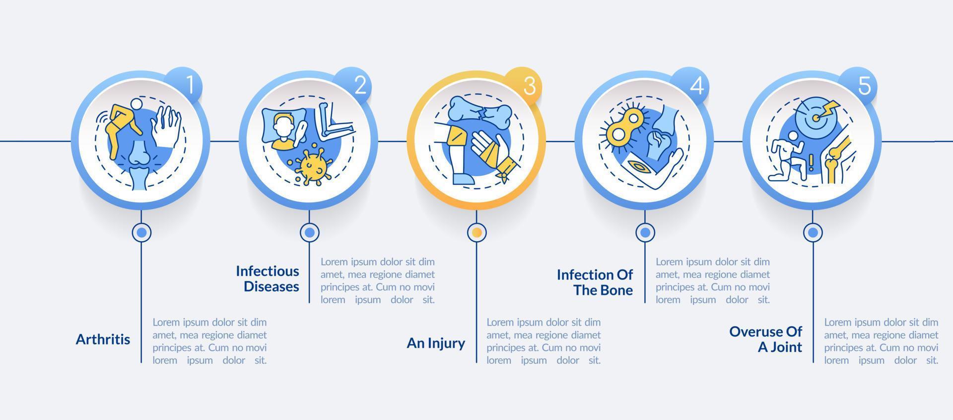 Inflammatory joint diseases circle infographic template. Injury risk. Data visualization with 5 steps. Process timeline info chart. Workflow layout with line icons. Lato-Bold, Regular fonts used Pro Vector
