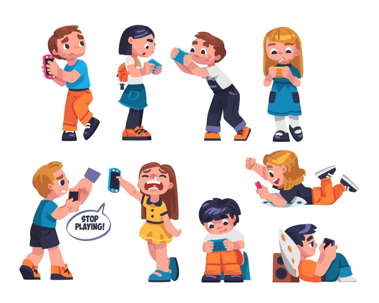 Children Addicted to Gadget Using Console Playing Game Set Pro Vector