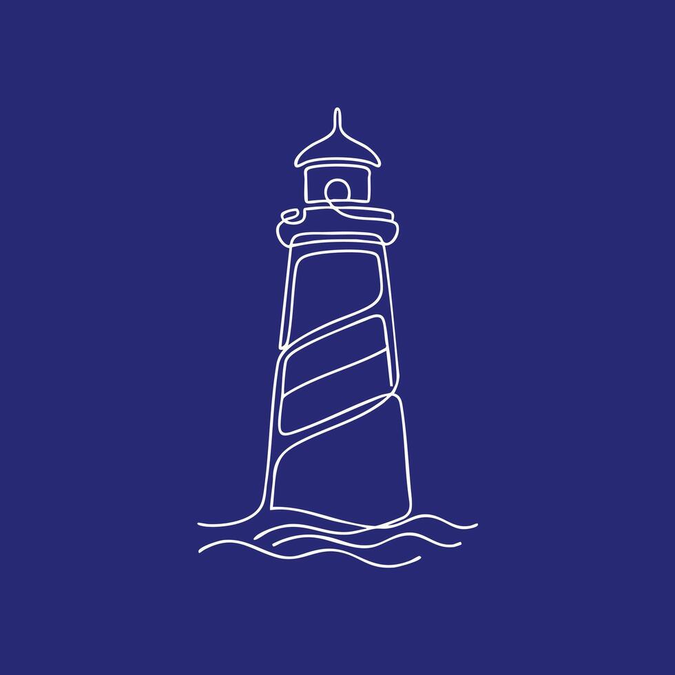 Minimalist Line Drawing of a Lighthouse on a Deep Blue with Wavy Water Lines at the Base Pro Vector