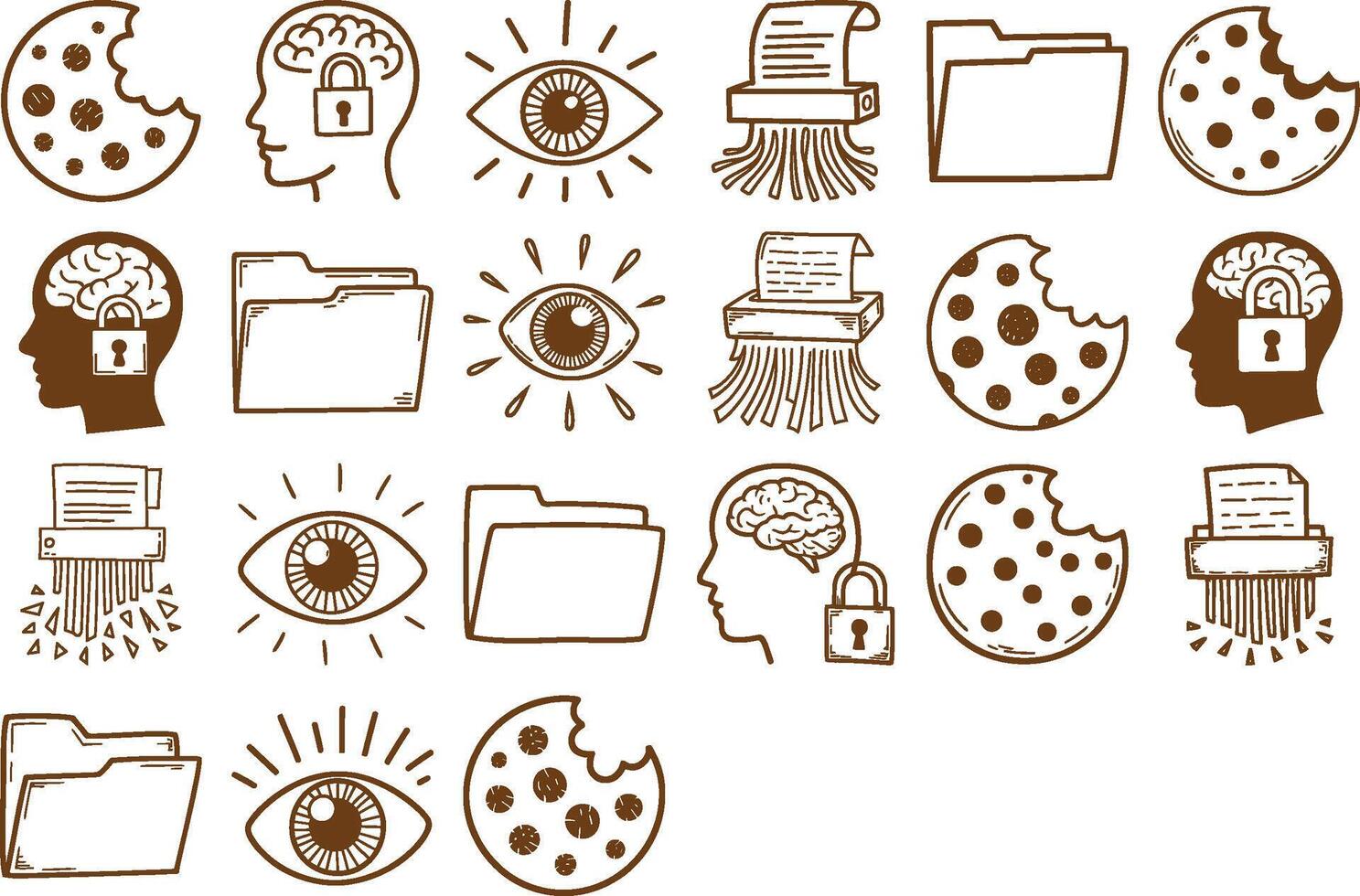Data privacy security doodle seamless pattern featuring cookies, eyes and paper shredders Pro Vector