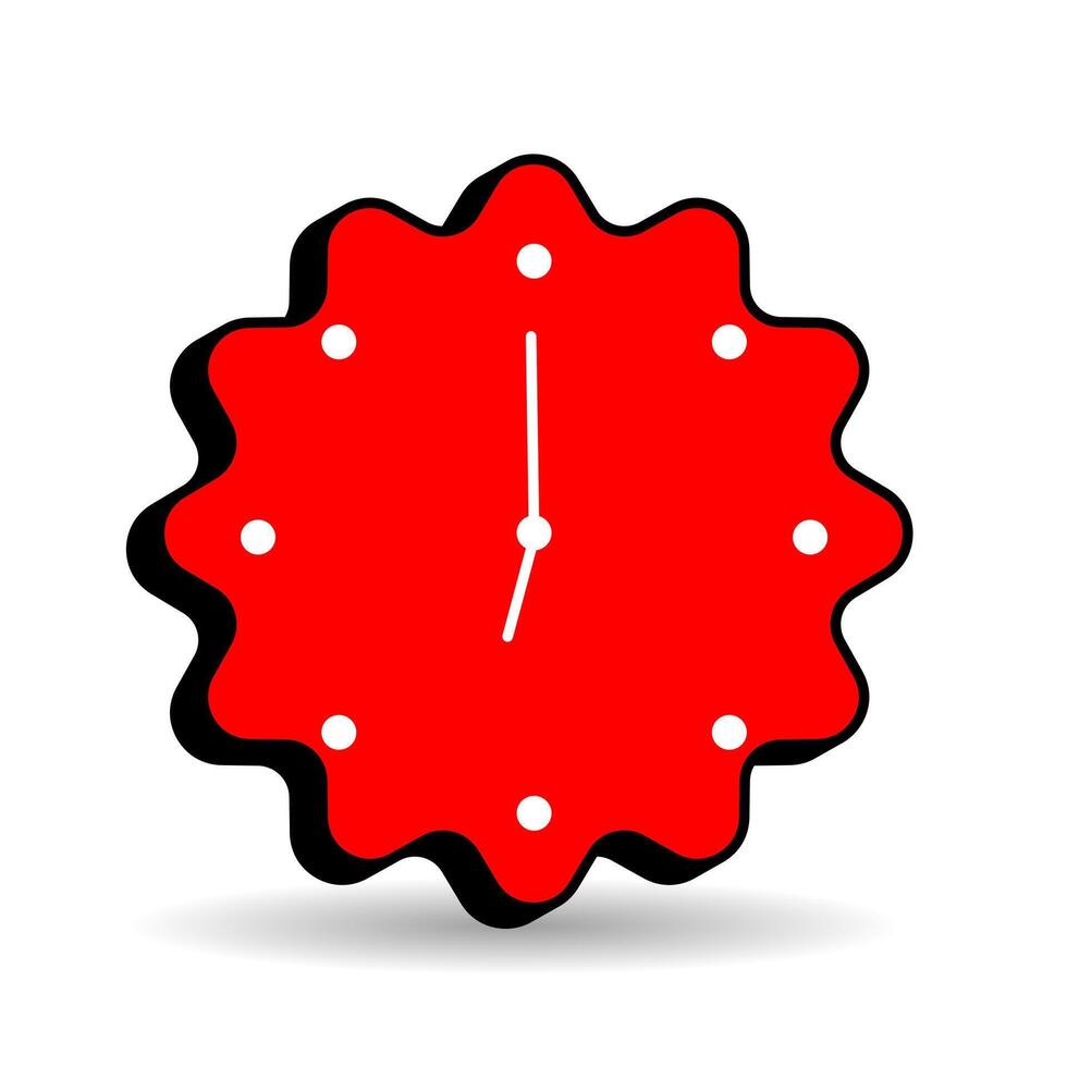 Red clock badge with scalloped edge and white hands pointing to twelve, perfect for time management, punctuality, scheduling, and digital interface design. Pro Vector